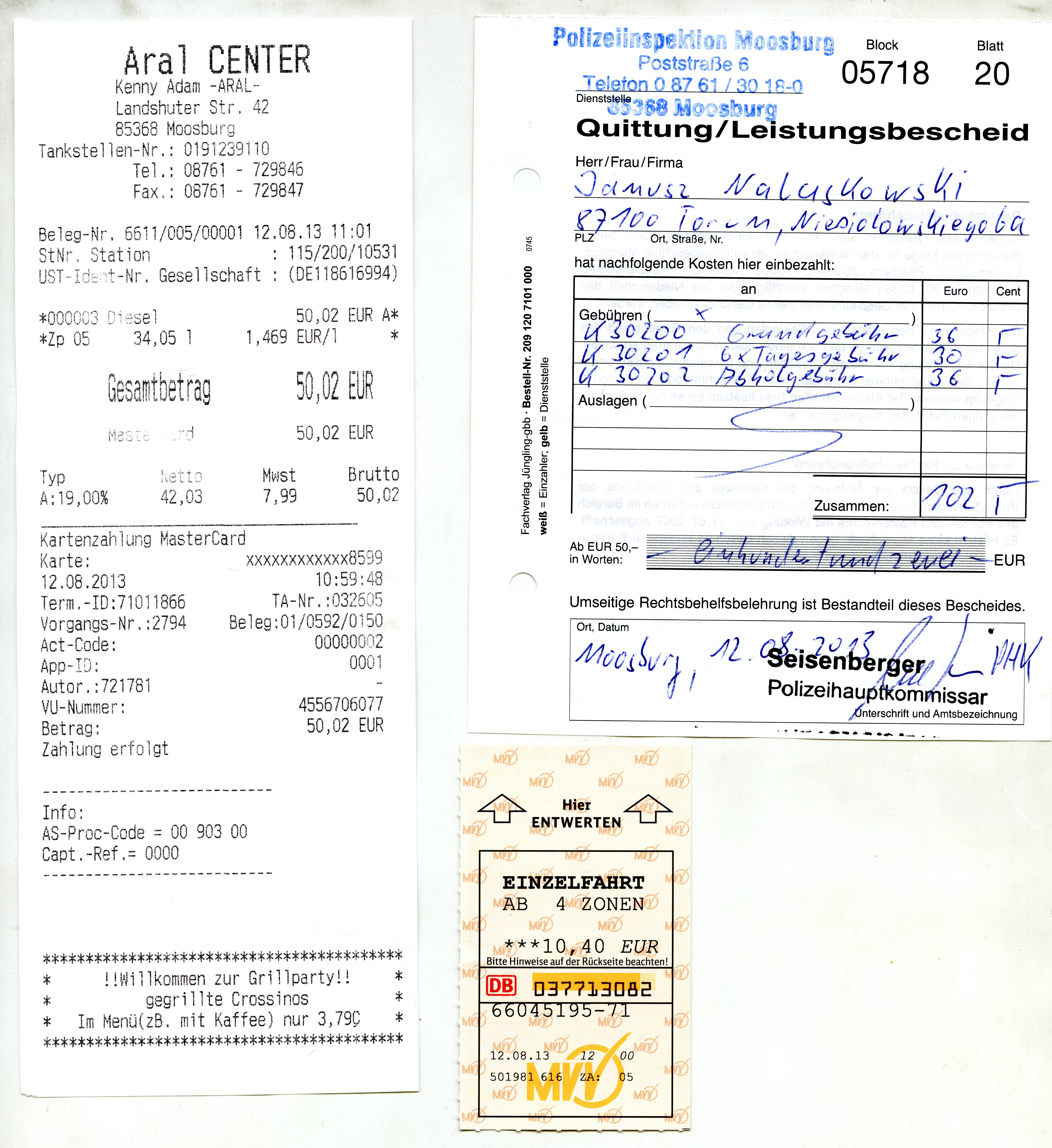 9 sierpnia awizowałem swój przyjazd do Mosburga 12 sierpnia faksem do Komendy Policji. Dnia 11 sierpnia udałem się do Mosburga komunikacją publiczną (Autobus rejsowy z Torunia– Monachium–pociąg do Mosburga). Na miejscu powiedziałem w jakiej sprawie przyjechałem. Po chwili oczekiwania przyszedł policjant, który krótko mnie przesłuchał, sporządził protokół przekazania samochodu, dokumentów i kluczyka i opowiedział mi historię zatrzymania pojazdu.
