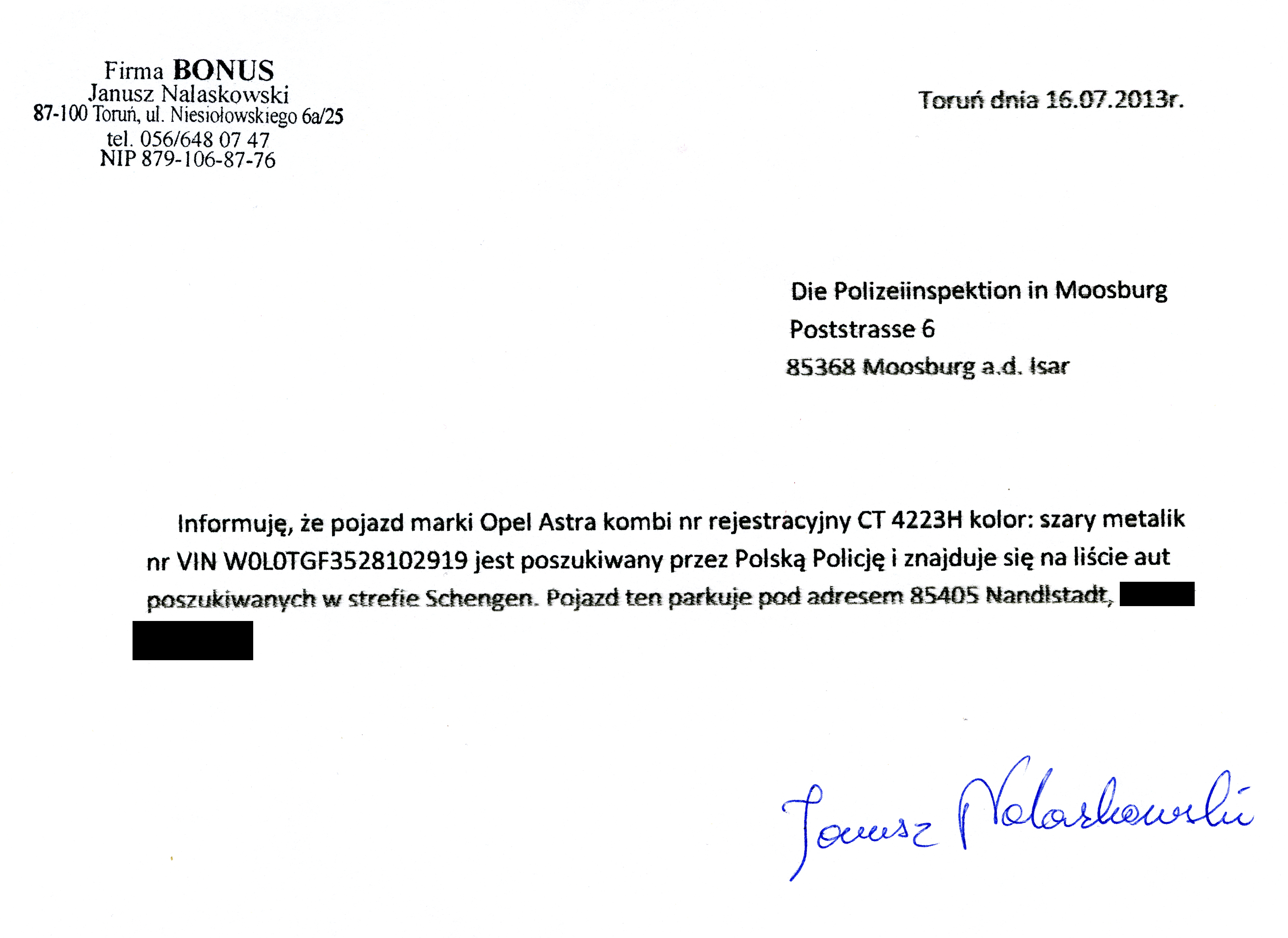 Następnego dnia otrzymałem obiecany skan dokumentu. 11 lipca skierowałem do Prokuratury Rejonowej Toruń Wschód oraz Komendy Powiatowej Policji w Toruniu pisma o jednakowym brzmieniu, w którym poinformowałem o wejściu w posiadanie dokumentu wskazującego adres zameldowania podejrzanych na terenie Niemiec, prosząc o szybkie działanie.