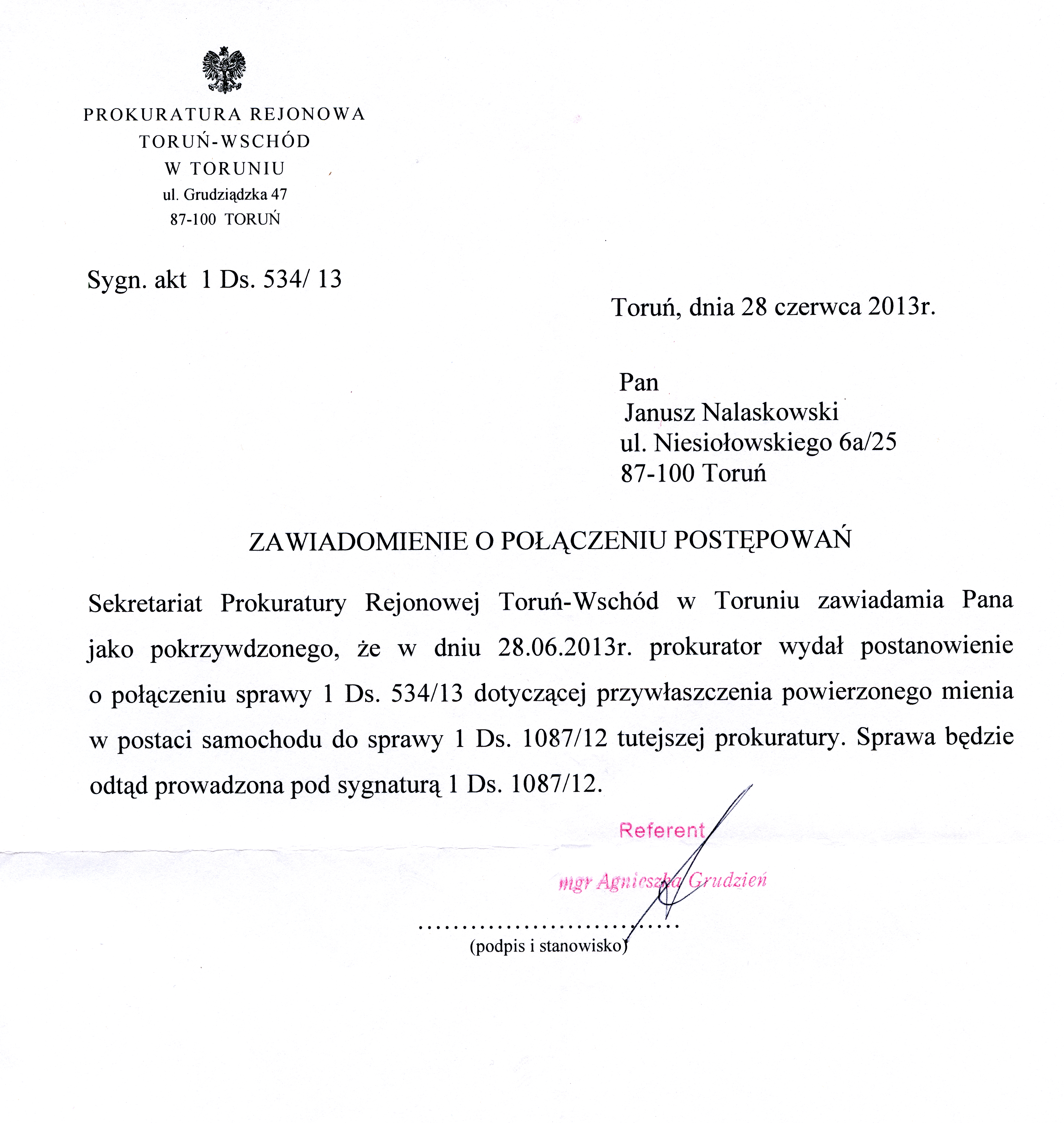 Tego samego dnia otrzymałem zawiadomienie o połączeniu postępowań dotyczących przywłaszczenia mienia w postaci samochodu do innej sprawy prowadzonej przeciwko małżeństwu S. przez tutejszą prokuraturę.