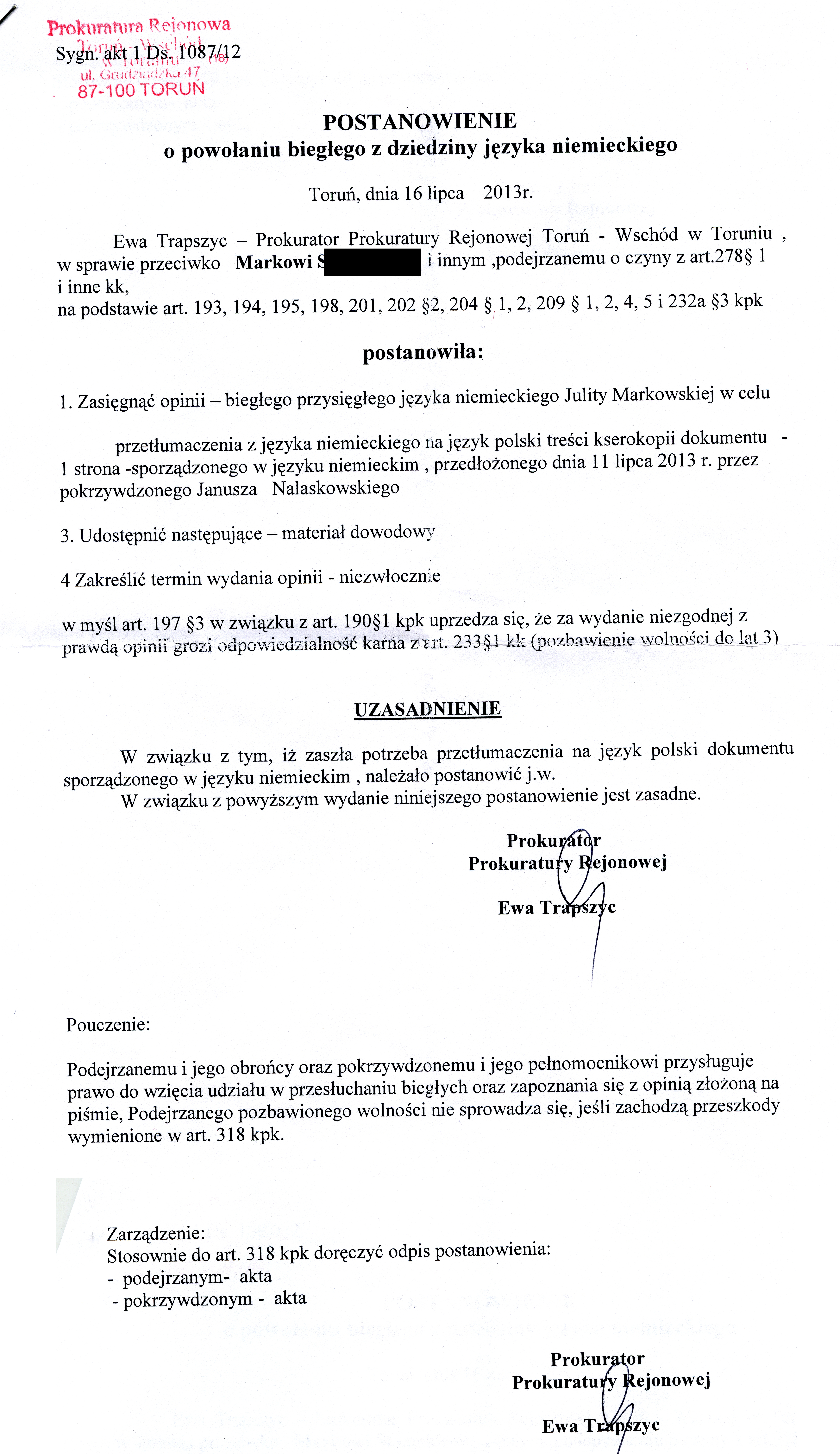Tego samego dnia otrzymałem także pismo o powołaniu biegłego z dziedziny języka niemieckiego, w celu przetłumaczenia na język polski kserokopii dokumentu.