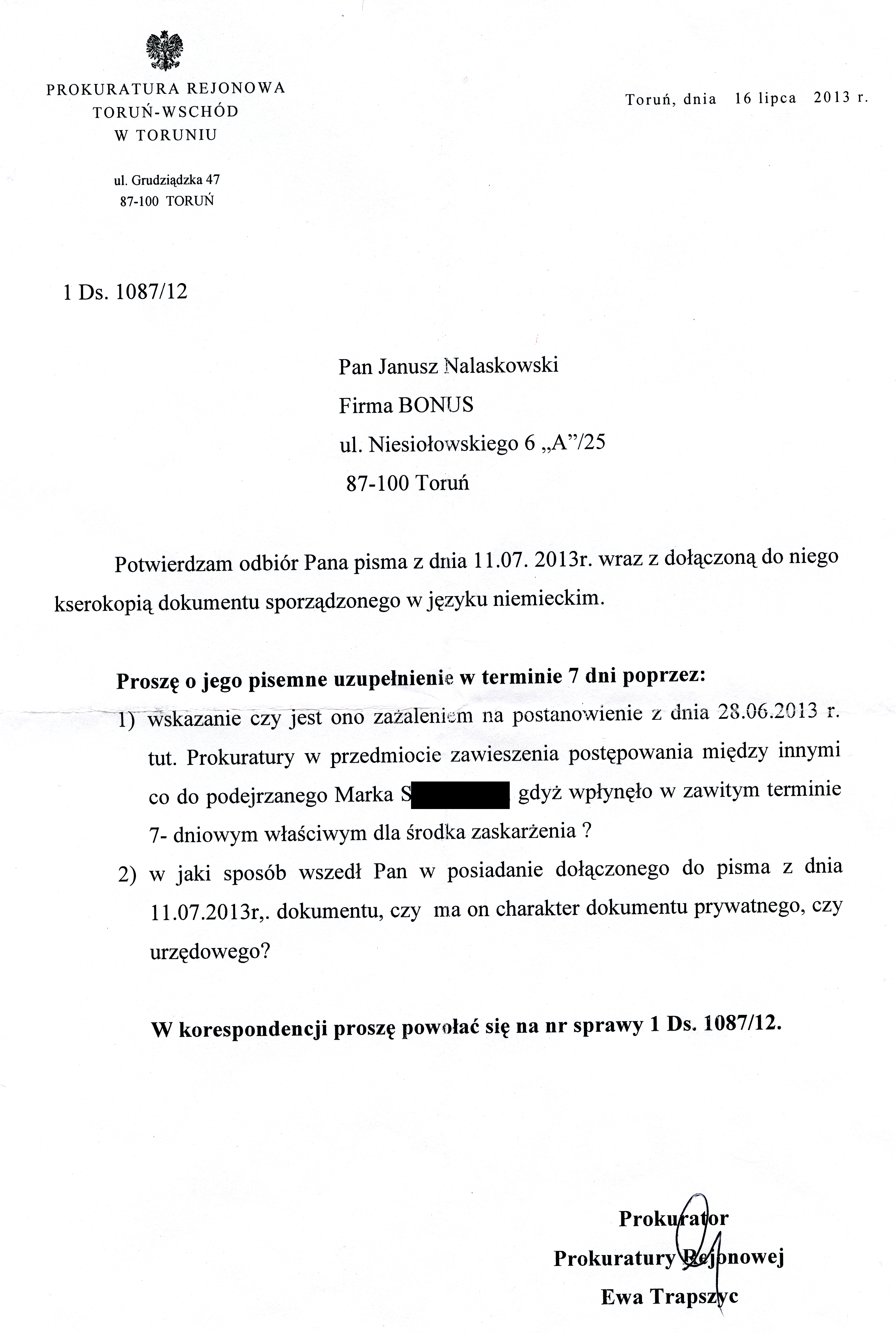 Już po 5 dniach (!) otrzymałem od Prokuratury Rejonowej Toruń Wschód pismo z pytaniami: